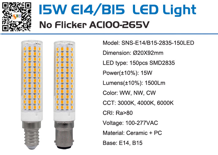 15W 1500Lm B15 LED light bulbs, dimmable and non-dimmable are available, Input voltage AC100-277V.